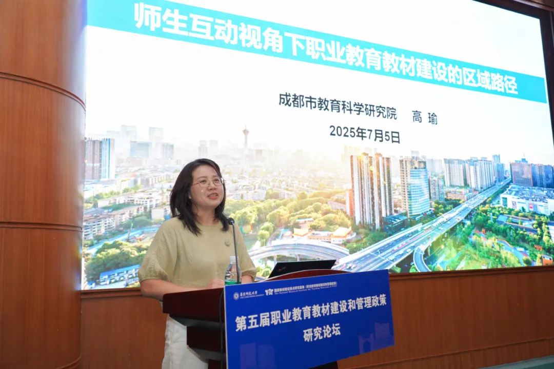 成都市教育科学研究院职成与高等教育研究所所长高瑜作题为《师生互动视角下职业教育教材建设的区域路径》的专题报告。她指出,成都市充分发挥教科研机构集成优势,盘活区域职业教育资源,构建了“市-片区-区-校”四级教研共同体,通过分层分类的线上线下混合式教研活动、“研培赛教”一体化的教师队伍培养模式,全面提升教师教材实施水平,实现了“教-学-评”的一致性。成都市还以微师培、数字学校为载体,开发了“随身随时随地”的教师研修资源和职业体验课程,促进了优质资源的共建共享和教材建设的提质增效。