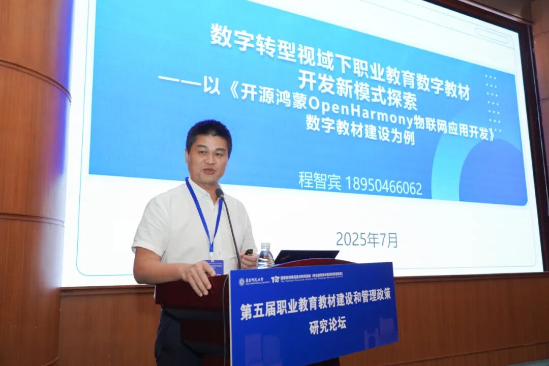 福建信息职业技术学院教务处处长程智宾在《数字转型视域下职业教育数字教材开发新模式探索——以<开源鸿蒙Open Harmony物联网应用开发>数字教材建设为例》的报告中,通过案例系统介绍了校企深度协同的教材开发模式。在该模式下,教材采用模块化架构和“基础-进阶-拓展”三级任务体系,构建了多模态数字资源与定制教具协同支撑的虚实融合教学生态,以及AI算法驱动的“学习循迹”与“个性化授课”一体化教学平台,实现了学习过程的伴随式数据采集与精准资源推送。