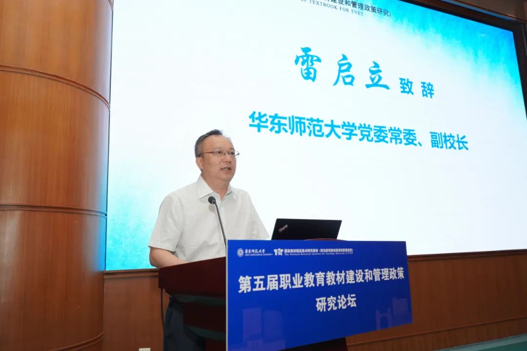 华东师范大学党委常委、副校长雷启立在致辞中欢迎各位领导、专家和同仁相聚上海,共话我国职业教育教材事业高质量发展大计。他表示,学校将以再次获批国家职业教育教材重点基地为契机,继续深化教材研究,推动基地建设、科学研究和学科建设三位一体,为我国教材事业贡献力量。